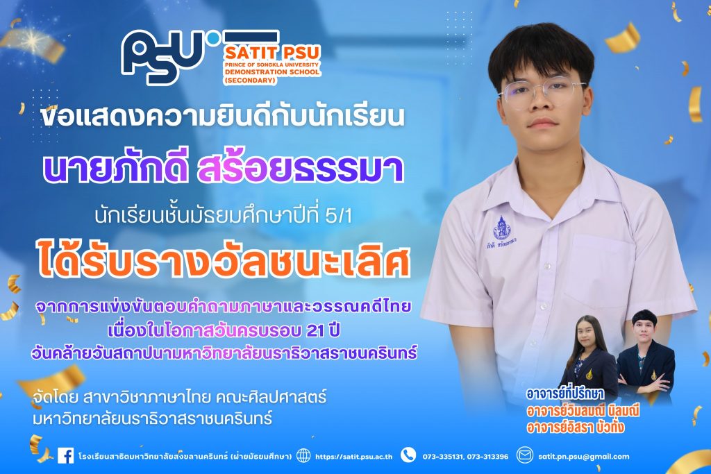 โรงเรียนสาธิตมหาวิทยาลัยสงขลานครินทร์ (ฝ่ายมัธยมศึกษา) ขอแสดงความยินดีกับนักเรียนที่สร้างผลงานโดดเด่นคว้ารางวัล จากการแข่งขันตอบคำถามภาษาและวรรณคดีไทย เนื่องในโอกาสวันครบรอบ 21 ปี วันคล้ายวันสถาปนามหาวิทยาลัยนราธิวาสราชนครินทร์ ซึ่งจัดโดยสาขาวิชาภาษาไทย คณะศิลปศาสตร์ มหาวิทยาลัยนราธิวาสราชนครินทร์ เพื่อส่งเสริมความรู้ ความสามารถ และทักษะด้านภาษาไทยและวรรณคดีไทยในระดับมัธยมศึกษา