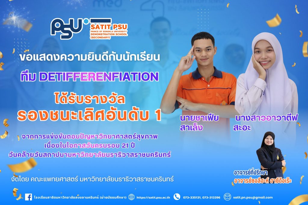 โรงเรียนสาธิตมหาวิทยาลัยสงขลานครินทร์ (ฝ่ายมัธยมศึกษา) ขอแสดงความยินดีกับนักเรียน ทีม DeTifferenFiation ที่สร้างผลงานโดดเด่นจากการเข้าร่วมการแข่งขันตอบปัญหาวิทยาศาสตร์สุขภาพ ครั้งที่ 10 (10th Medical Science Quiz) เนื่องในโอกาสวันสถาปนามหาวิทยาลัยนราธิวาสราชนครินทร์ ครั้งที่ 21 ซึ่งจัดโดยคณะแพทยศาสตร์ มหาวิทยาลัยนราธิวาสราชนครินทร์ และสามารถคว้ารางวัลรองชนะเลิศอันดับ 1