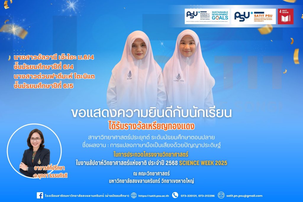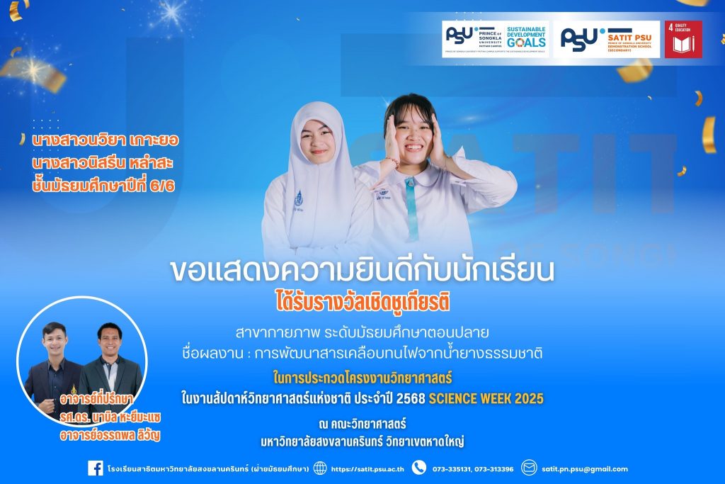 โรงเรียนสาธิตมหาวิทยาลัยสงขลานครินทร์ (ฝ่ายมัธยมศึกษา)ขอแสดงความยินดีกับนักเรียนที่ได้รับรางวัลจากการประกวดโครงงานวิทยาศาสตร์ ระดับมัธยมศึกษาตอนต้นและตอนปลาย ประจำปี 2568