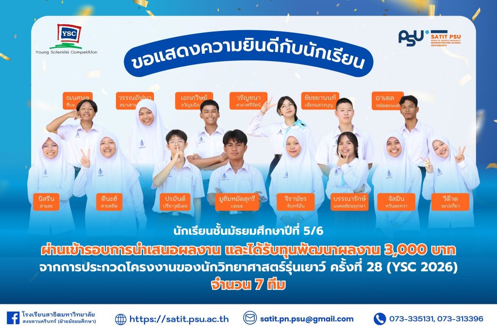 นักเรียนโรงเรียนสาธิต ม.อ. ฝ่ายมัธยมศึกษา ผ่านเข้ารอบการนำเสนอผลงาน จากการประกวดโครงงานของนักวิทยาศาสตร์รุ่นเยาว์ ครั้งที่ 28 (YSC 2026) จำนวน 7 ทีม