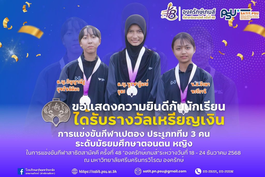 โรงเรียนสาธิตมหาวิทยาลัยสงขลานครินทร์ (ฝ่ายมัธยมศึกษา) ขอแสดงความยินดีกับนักเรียนที่สร้างผลงานยอดเยี่ยมจากการแข่งขันกีฬาสาธิตสามัคคี ครั้งที่ 48 “องครักษ์เกมส์” ระหว่างวันที่ 18 – 24 ธันวาคม 2568 ณ มหาวิทยาลัยศรีนครินทรวิโรฒ องครักษ์ โดยมีผลการแข่งขันดังนี้