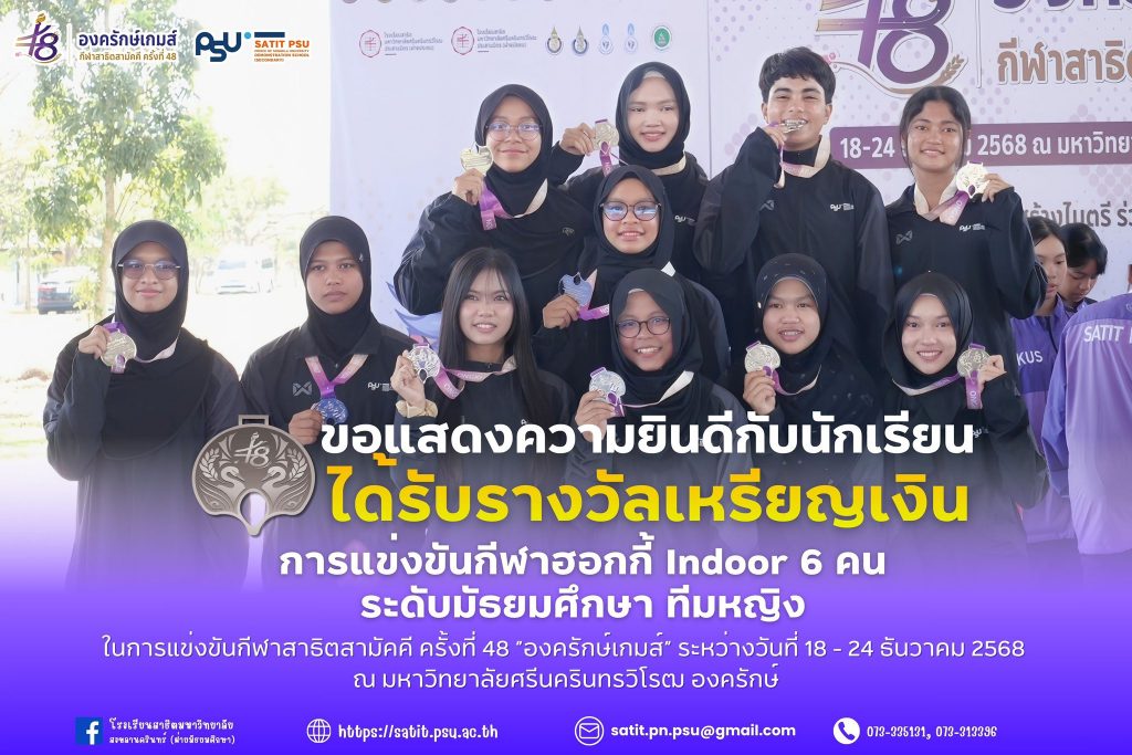 โรงเรียนสาธิตมหาวิทยาลัยสงขลานครินทร์ (ฝ่ายมัธยมศึกษา) ขอแสดงความยินดีกับนักเรียนที่สร้างผลงานยอดเยี่ยมจากการแข่งขันกีฬาสาธิตสามัคคี ครั้งที่ 48 “องครักษ์เกมส์” ระหว่างวันที่ 18 – 24 ธันวาคม 2568 ณ มหาวิทยาลัยศรีนครินทรวิโรฒ องครักษ์ โดยมีผลการแข่งขันดังนี้