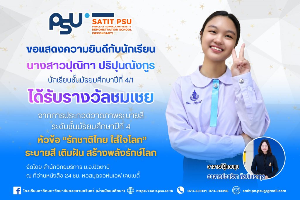 โรงเรียนสาธิตมหาวิทยาลัยสงขลานครินทร์ (ฝ่ายมัธยมศึกษา) ขอแสดงความยินดีกับนักเรียนที่ได้รับรางวัลจากการประกวดวาดภาพระบายสี หัวข้อ “รักชาติไทย ใส่ใจโลก” ภายใต้แนวคิด ระบายสี เติมฝัน สร้างพลังรักษ์โลก ซึ่งจัดขึ้นเพื่อส่งเสริมความคิดสร้างสรรค์ ปลูกฝังจิตสำนึกด้านความรักชาติและการอนุรักษ์สิ่งแวดล้อมให้แก่เยาวชน