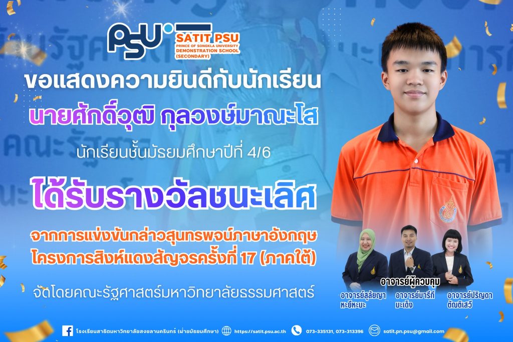 โรงเรียนสาธิตมหาวิทยาลัยสงขลานครินทร์ (ฝ่ายมัธยมศึกษา) ขอแสดงความยินดีกับนักเรียนที่สร้างชื่อเสียงให้แก่โรงเรียน จากการเข้าร่วมการแข่งขันกล่าวสุนทรพจน์ภาษาอังกฤษ โครงการ “สิงห์แดงสัญจร ครั้งที่ 17” (ภาคใต้) ซึ่งจัดโดยคณะรัฐศาสตร์ มหาวิทยาลัยธรรมศาสตร์