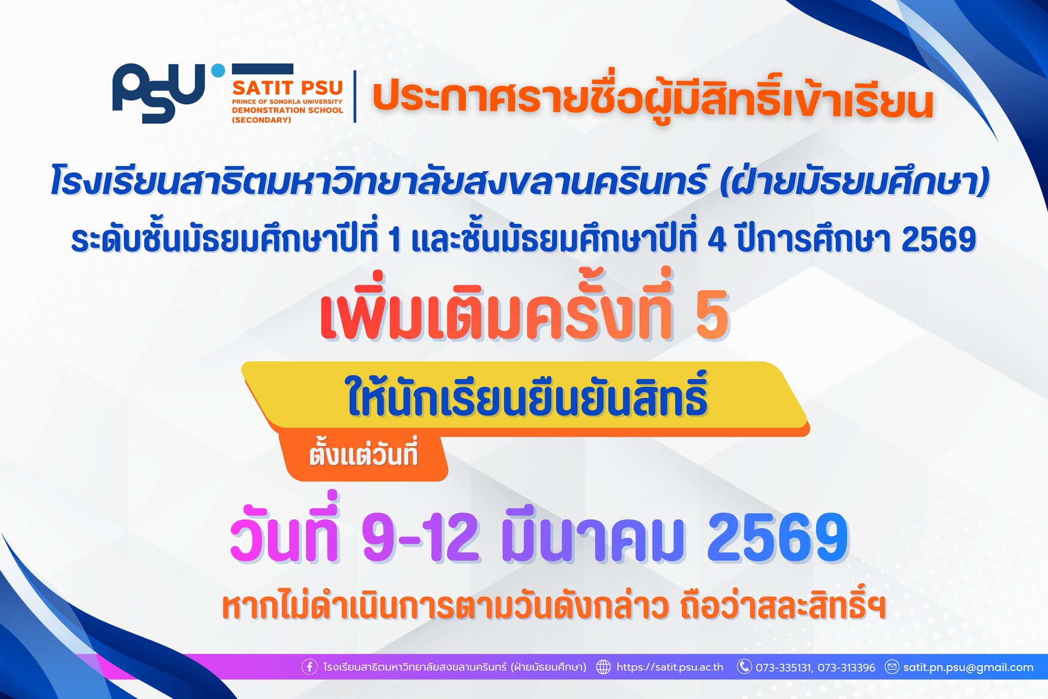 ประกาศรายชื่อผู้มีสิทธิ์เข้าเรียน โรงเรียนสาธิตมหาวิทยาลัยสงขลานครินทร์ (ฝ่ายมัธยมศึกษา) ปีการศึกษา 2569 (เพิ่มเติมครั้งที่5)