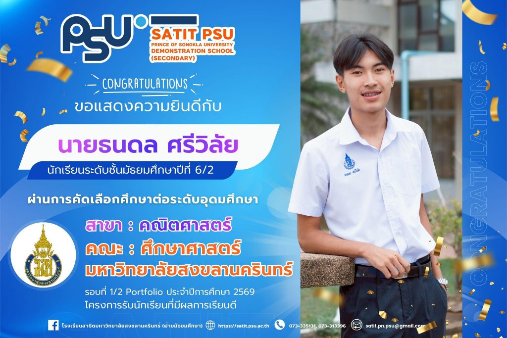 โรงเรียนสาธิตมหาวิทยาลัยสงขลานครินทร์ (ฝ่ายมัธยมศึกษา) ขอชื่นชมในความมุ่งมั่น ตั้งใจ และความสามารถของนักเรียน และขออวยพรให้ประสบความสำเร็จในการศึกษาและวิชาชีพในอนาคตต่อไป 🌟