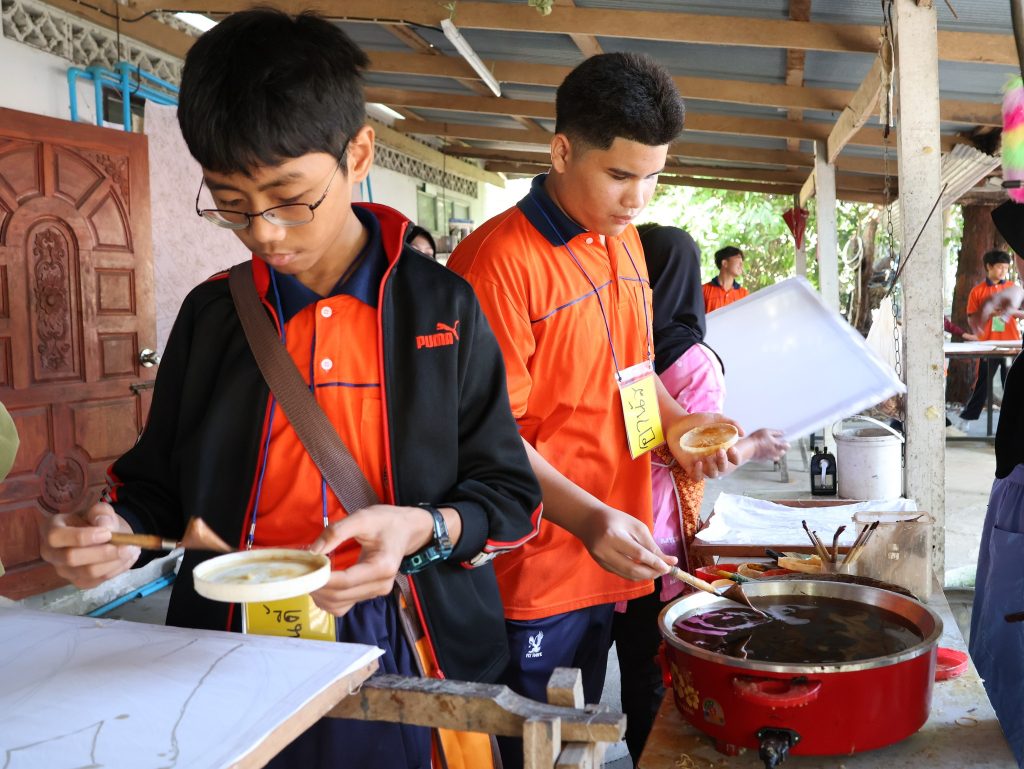 • ฐานที่ 2 ฐานที่ 2 ชุมชนผลิตภัณฑ์งานผ้าบาติก ณ ยาริง บาติก วิสาหกิจชุมชน ฝึกปฏิบัติการทำผ้าบาติก ตั้งแต่การขึงเฟรม วาดลวดลาย การใช้สี และการลงสีอย่างสร้างสรรค์