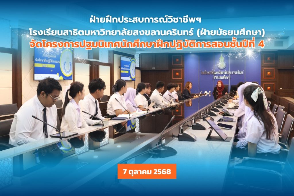 วันที่ 7 ตุลาคม 2568 เวลา 09.00 – 12.00 น. ฝ่ายฝึกประสบการณ์วิชาชีพฯ โรงเรียนสาธิตมหาวิทยาลัยสงขลานครินทร์ (ฝ่ายมัธยมศึกษา) จัดโครงการปฐมนิเทศนักศึกษาฝึกปฏิบัติการสอน ระดับชั้นปีที่ 4 ประจำภาคการศึกษาที่ 2 ปีการศึกษา 2568 ณ ห้องประชุมอาคาร 11 โรงเรียนสาธิตมหาวิทยาลัยสงขลานครินทร์ (ฝ่ายมัธยมศึกษา)