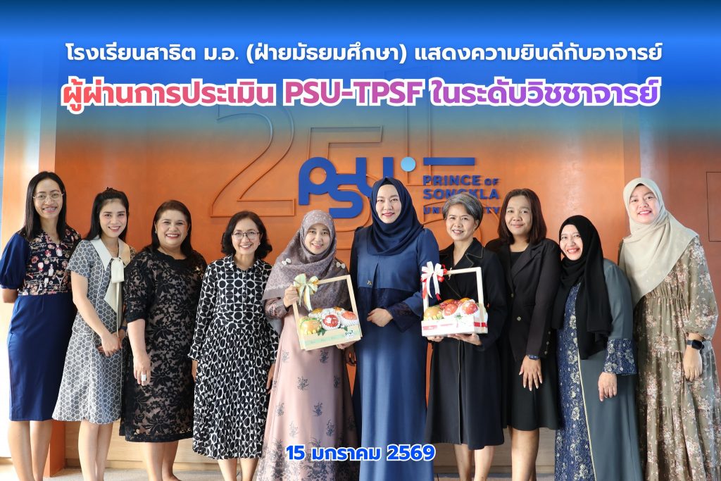 วันที่ 15 มกราคม 2569 นางโซเฟีย มะลี ผู้อำนวยการโรงเรียนสาธิตมหาวิทยาลัยสงขลานครินทร์ (ฝ่ายมัธยมศึกษา) พร้อมด้วยคณะผู้บริหาร คณาจารย์ และบุคลากร ร่วมมอบกระเช้าแสดงความยินดีแก่อาจารย์เต็มเดือน เต้าแก้ว และอาจารย์วัสลีณา หาไม อาจารย์ประจำกลุ่มสาระการเรียนรู้คณิตศาสตร์ เนื่องในโอกาสได้รับการรับรองผ่านการประเมินมาตรฐานสมรรถนะอาจารย์ มหาวิทยาลัยสงขลานครินทร์ (PSU–TPSF) ในระดับ วิชชาจารย์ (Professional Teacher) ซึ่งมีผลตั้งแต่วันที่ 16 ธันวาคม 2568