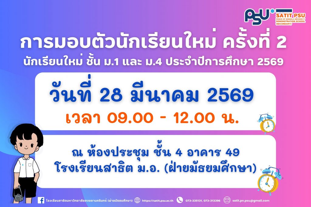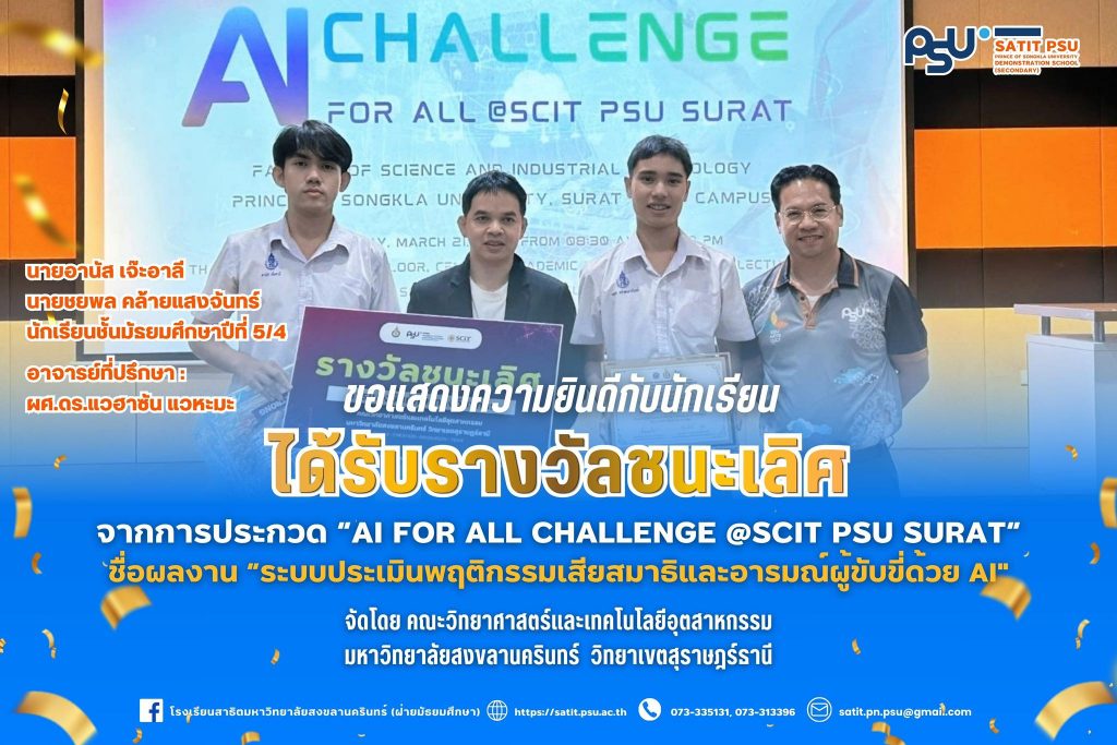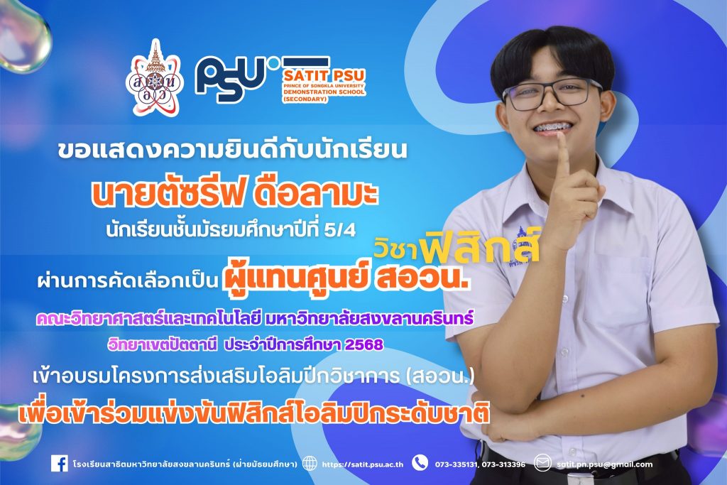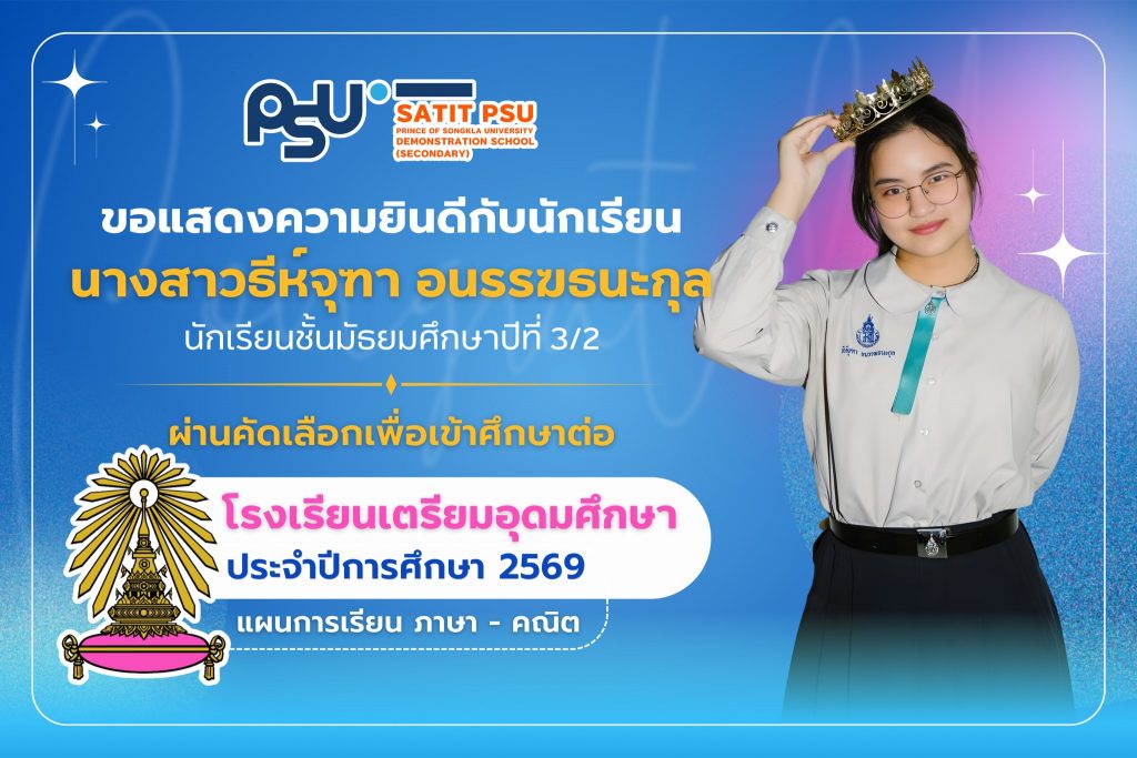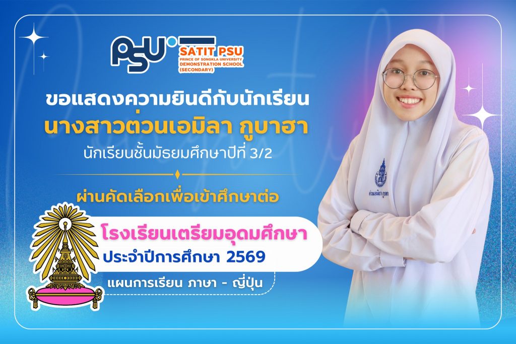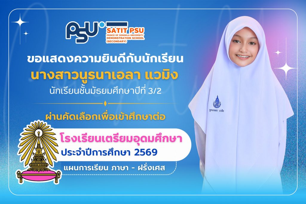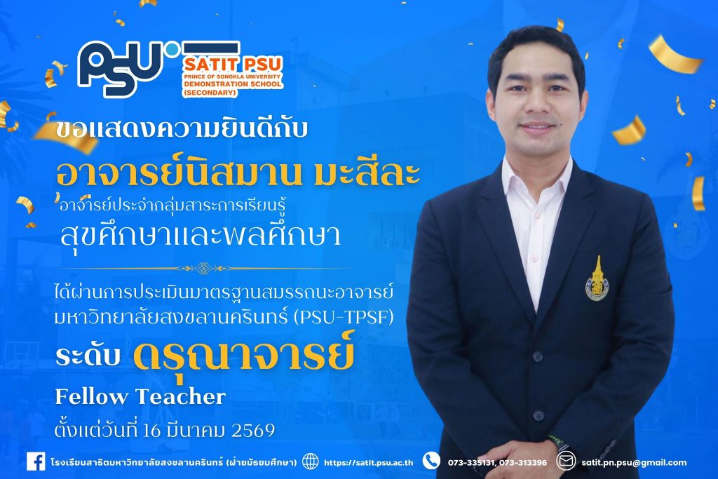 โรงเรียนสาธิตมหาวิทยาลัยสงขลานครินทร์ (ฝ่ายมัธยมศึกษา) ขอแสดงความยินดีกับ อาจารย์นิสมาน มะสีละ อาจารย์ประจำกลุ่มสาระการเรียนรู้สุขศึกษาและพลศึกษา ที่ได้รับการรับรองผ่านการประเมินมาตรฐานสมรรถนะอาจารย์ มหาวิทยาลัยสงขลานครินทร์ (PSU–TPSF) ในระดับ ดรุณาจารย์ (Fellow Teacher) ตั้งแต่วันที่ 16 มีนาคม 2569 การได้รับการรับรองในครั้งนี้ สะท้อนถึงความมุ่งมั่นในการพัฒนาศักยภาพด้านการจัดการเรียนการสอน การส่งเสริมผู้เรียนอย่างรอบด้าน ตลอดจนความเป็นมืออาชีพในวิชาชีพครู นับเป็นอีกหนึ่งความภาคภูมิใจของโรงเรียน อีกทั้งยังเป็นแบบอย่างที่ดีให้แก่คณาจารย์และบุคลากร ในการพัฒนาตนเองสู่ความเป็นเลิศทางวิชาชีพ โรงเรียนสาธิตมหาวิทยาลัยสงขลานครินทร์ (ฝ่ายมัธยมศึกษา) ขอร่วมแสดงความยินดีอย่างยิ่งกับความสำเร็จอันทรงคุณค่าในครั้งนี้ และขอเป็นกำลังใจให้อาจารย์นิสมาน มะสีละ ยังคงมุ่งมั่นพัฒนาตนเอง สร้างสรรค์ผลงานทางวิชาการ และเป็นแรงบันดาลใจที่ดีให้แก่นักเรียนและเพื่อนร่วมวิชาชีพสืบไป