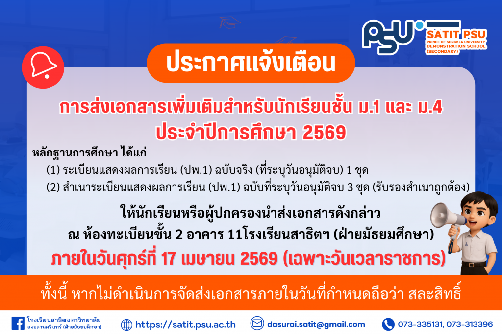 โรงเรียนสาธิตมหาวิทยาลัยสงขลานครินทร์ (ฝ่ายมัธยมศึกษา) ขอแจ้งเตือนสำหรับนักเรียนใหม่ระดับชั้นมัธยมศึกษาปีที่ 1 และมัธยมศึกษาปีที่ 4 ประจำปีการศึกษา 2569 ที่ยังไม่ได้นำส่งเอกสารหลักฐานทางการศึกษา ให้ดำเนินการจัดส่งเอกสารเพิ่มเติมโดยเร่งด่วน เพื่อให้การขึ้นทะเบียนเป็นนักเรียนเป็นไปอย่างถูกต้องและครบถ้วนตามระเบียบของโรงเรียน ทั้งนี้ เอกสารที่ต้องนำส่งประกอบด้วย 1. ระเบียนแสดงผลการเรียน (ปพ.1) ฉบับจริง ที่ระบุวันอนุมัติจบ จำนวน 1 ชุด 2. สำเนาระเบียนแสดงผลการเรียน (ปพ.1) ฉบับที่ระบุวันอนุมัติจบ จำนวน 3 ชุด โดยต้องรับรองสำเนาถูกต้องทุกฉบับ โดยให้นักเรียนหรือผู้ปกครองนำส่งเอกสารดังกล่าว ณ ห้องทะเบียน ชั้น 2 อาคาร 11 โรงเรียนสาธิตมหาวิทยาลัยสงขลานครินทร์ (ฝ่ายมัธยมศึกษา) ภายในวันศุกร์ที่ 17 เมษายน 2569 เฉพาะวันและเวลาราชการ โรงเรียนขอเน้นย้ำว่า หากไม่ดำเนินการจัดส่งเอกสารภายในระยะเวลาที่กำหนด จะถือว่าสละสิทธิ์การเข้าเรียนตามระเบียบของโรงเรียน จึงขอความร่วมมือจากนักเรียนและผู้ปกครองดำเนินการให้เรียบร้อยภายในเวลาที่กำหนดเพื่อรักษาสิทธิ์ในการเข้าเรียน