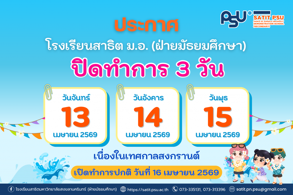 📢 ประกาศจากโรงเรียนสาธิตมหาวิทยาลัยสงขลานครินทร์ (ฝ่ายมัธยมศึกษา)โรงเรียนขอแจ้งปิดทำการเป็นเวลา 3 วัน เนื่องในเทศกาลสงกรานต์ 💦ระหว่างวันที่ 13 – 15 เมษายน 2569และจะเปิดทำการตามปกติในวันพฤหัสบดีที่ 16 เมษายน 2569ขอให้ นักเรียน ผู้ปกครอง และทุกท่าน มีความสุขในช่วงเทศกาลสงกรานต์ เดินทางปลอดภัย และใช้เวลาร่วมกับครอบครัวอย่างอบอุ่น พร้อมร่วมสืบสานประเพณีไทยอันดีงามไปด้วยกันนะคะ 🌸✨ขออภัยในความไม่สะดวกมา ณ โอกาสนี้