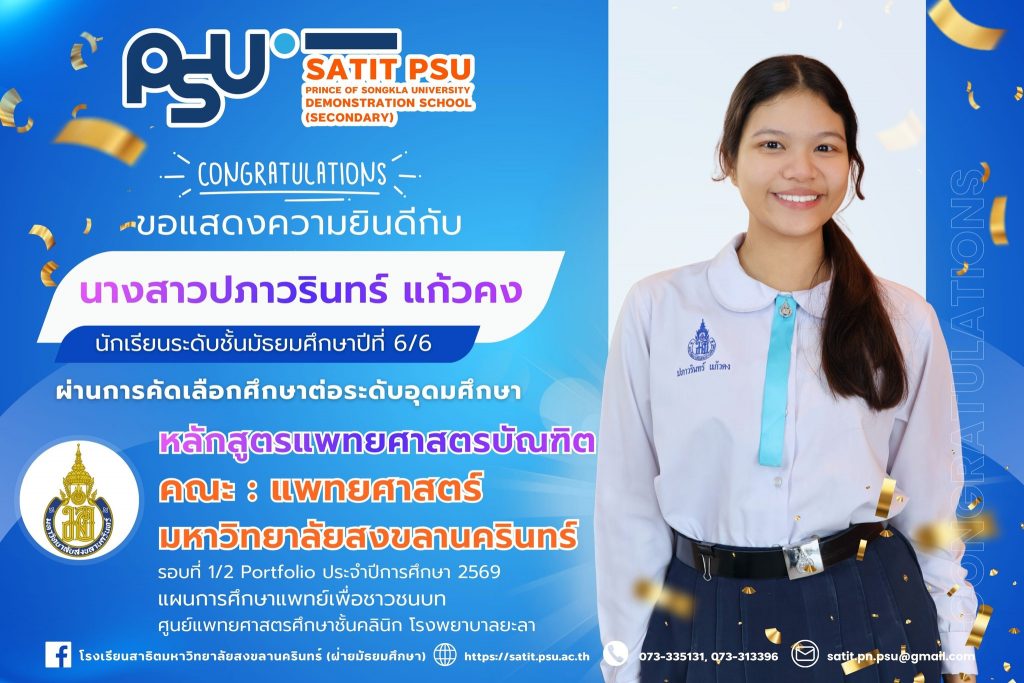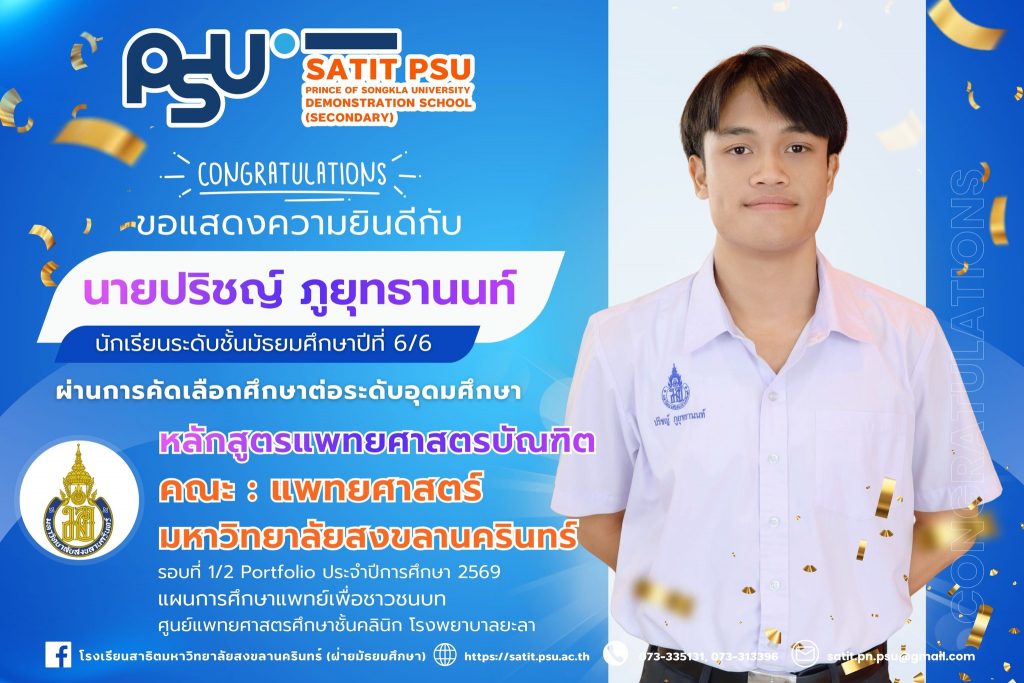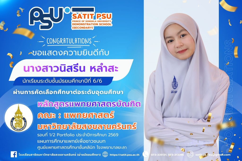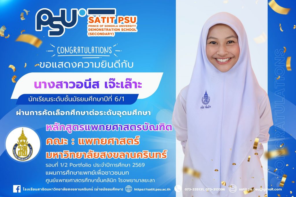 โรงเรียนสาธิตมหาวิทยาลัยสงขลานครินทร์ (ฝ่ายมัธยมศึกษา)ขอแสดงความยินดีกับนักเรียนที่ผ่านการคัดเลือกเข้าศึกษาต่อระดับอุดมศึกษา ประจำปีการศึกษา 2569