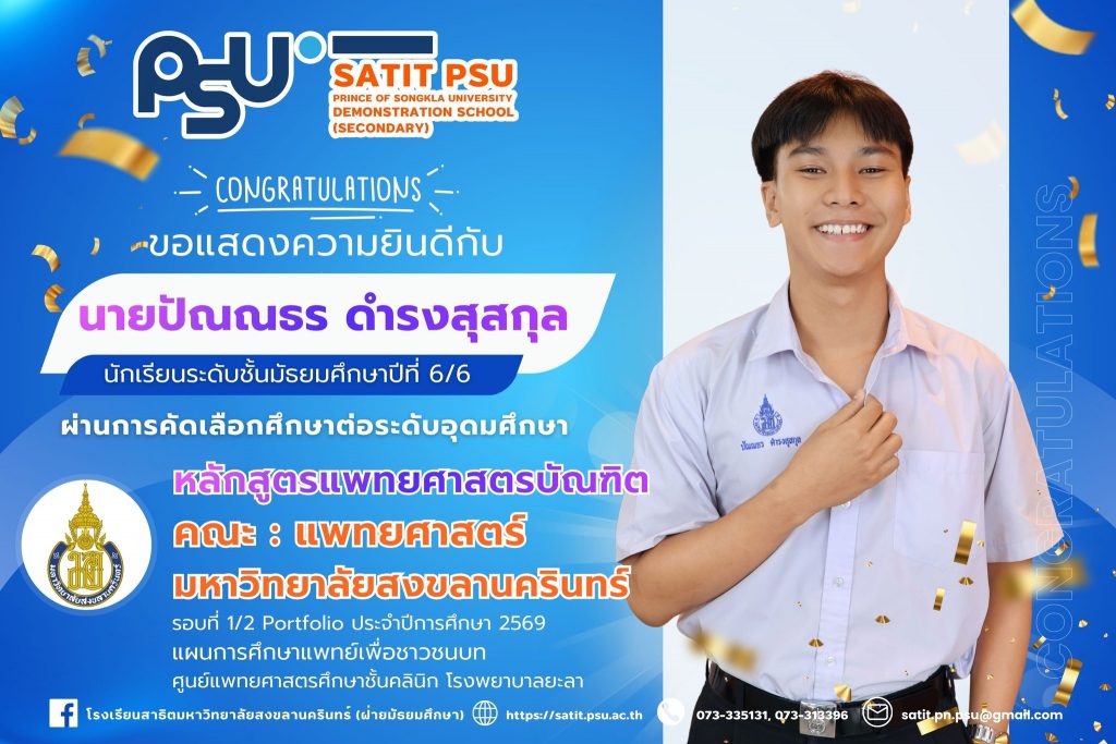 🎉 ขอแสดงความยินดีกับนายธนดล ศรีวิลัยนักเรียนระดับชั้นมัธยมศึกษาปีที่ 6/2ผ่านการคัดเลือกเข้าศึกษาต่อระดับอุดมศึกษา📚 สาขา : คณิตศาสตร์🎓 คณะ : ศึกษาศาสตร์🏫 มหาวิทยาลัยสงขลานครินทร์📌 รอบที่ 1/2 Portfolio ประจำปีการศึกษา 2569 โครงการรับนักเรียนที่มีผลการเรียนดีโรงเรียนสาธิตมหาวิทยาลัยสงขลานครินทร์ (ฝ่ายมัธยมศึกษา) ขอชื่นชมในความมุ่งมั่น ตั้งใจ และความสามารถของนักเรียน และขออวยพรให้ประสบความสำเร็จในการศึกษาและวิชาชีพในอนาคตต่อไป 🌟