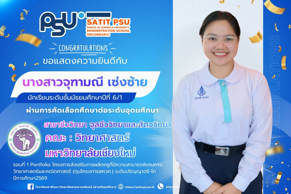 โรงเรียนสาธิตมหาวิทยาลัยสงขลานครินทร์ (ฝ่ายมัธยมศึกษา)ขอแสดงความยินดีกับนักเรียนที่ผ่านการคัดเลือกเข้าศึกษาต่อระดับอุดมศึกษา ประจำปีการศึกษา 2569