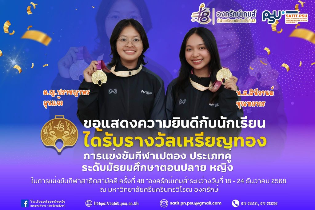 โรงเรียนสาธิตมหาวิทยาลัยสงขลานครินทร์ (ฝ่ายมัธยมศึกษา) ขอแสดงความยินดีกับนักเรียนที่สร้างชื่อเสียงให้แก่โรงเรียน จากการเข้าร่วมการแข่งขันกล่าวสุนทรพจน์ภาษาอังกฤษ โครงการ “สิงห์แดงสัญจร ครั้งที่ 17” (ภาคใต้) ซึ่งจัดโดยคณะรัฐศาสตร์ มหาวิทยาลัยธรรมศาสตร์ ความสำเร็จในครั้งนี้สะท้อนให้เห็นถึงศักยภาพด้านทักษะภาษาอังกฤษ ความสามารถในการสื่อสาร และความกล้าแสดงออกของนักเรียน ตลอดจนการส่งเสริมและพัฒนาผู้เรียนอย่างรอบด้านของโรงเรียนสาธิตมหาวิทยาลัยสงขลานครินทร์ (ฝ่ายมัธยมศึกษา) โรงเรียนขอร่วมแสดงความยินดีและภาคภูมิใจในความสำเร็จของนักเรียนทั้งสองคน และขอเป็นกำลังใจให้พัฒนาศักยภาพสู่ความเป็นเลิศต่อไปในอนาคต