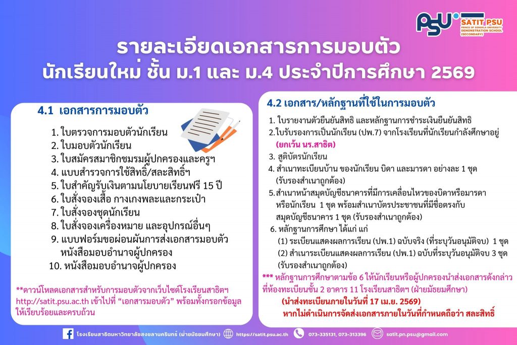 หมายเหตุ : 1. ดาวน์โหลดเอกสารสำหรับการมอบตัวจากเว็บไซต์โรงเรียนสาธิตมหาวิทยาลัยสงขลานครินทร์ (ฝ่ายมัธยมศึกษา) http://satit.psu.ac.th เข้าไปที่ “เอกสารมอบตัว” พร้อมทั้งกรอกข้อมูล ให้เรียบร้อยและครบถ้วน